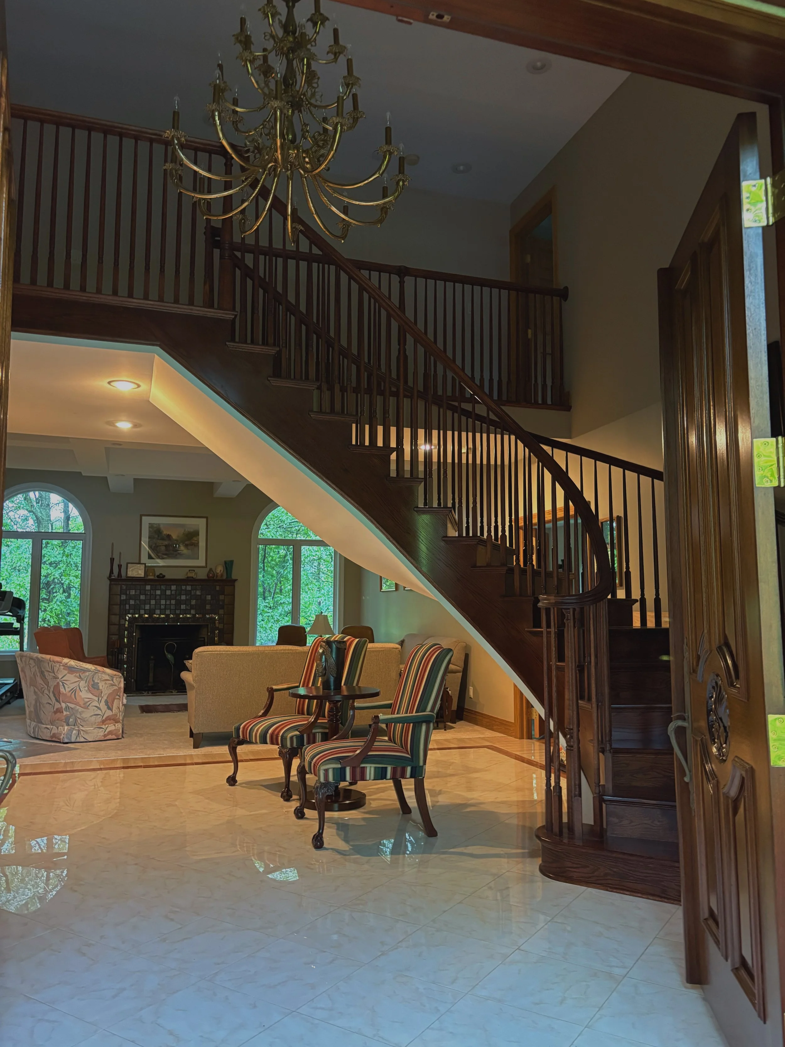 This elegant single-family home features a richly detailed brick exterior accented by multiple gables, creating a classic and timeless aesthetic. A sweeping curved staircase anchors the grand interior foyer, where gleaming granite floors reflect natural light and enhance the home's luxurious feel. Extensive landscaping surrounds the property with mature trees, manicured gardens, and winding stone paths that elevate curb appeal. Inside, warm tones, crown molding, and arched windows blend traditional charm with refined finishes, offering an inviting yet sophisticated environment for family living and entertaining.