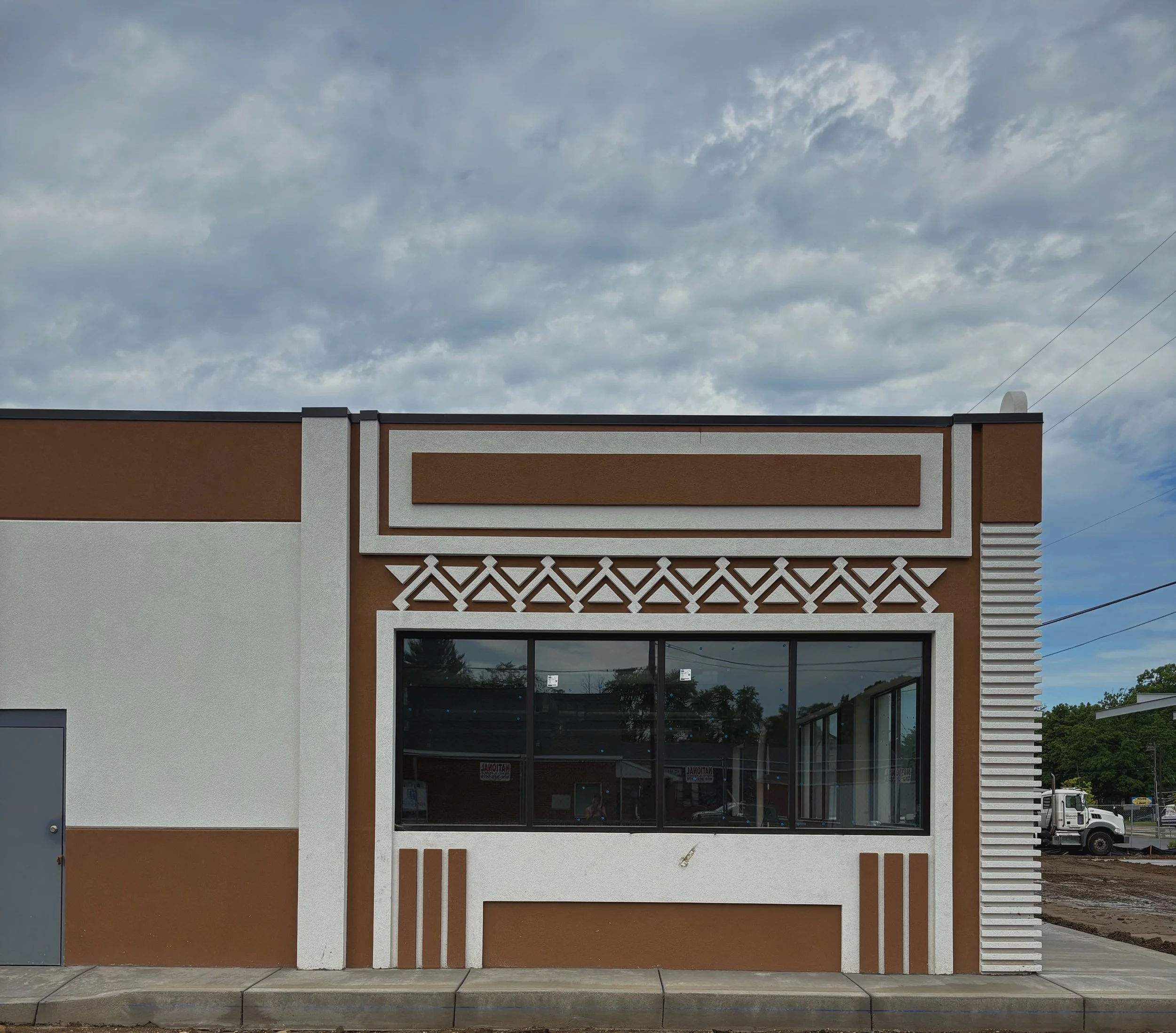 This gas station convenience store features a distinctive architectural style that blends functionality with cultural flair, showcasing a warm terracotta stucco façade accented by crisp white geometric patterns and arched detailing inspired by traditional Mediterranean carvings. The interplay of textures and shapes adds visual richness and depth, transforming a typically utilitarian structure into a visually engaging destination. Arched entryways and ornamental trim soften the building’s form, while the earthy color palette creates a welcoming atmosphere that resonates with the warmth of desert architecture. The result is a unique and inviting space that elevates the everyday experience of refueling and refreshment.
