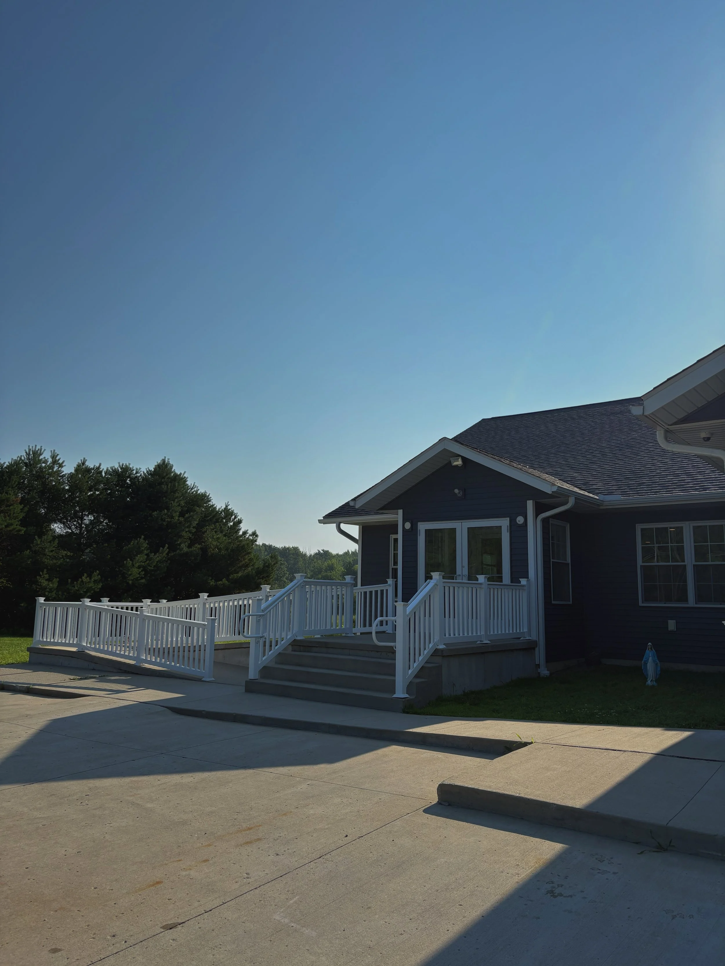 This modern assisted living facility features a spacious single-story layout with a clean, inviting design. The building is clad in dark blue siding, complemented by crisp white trim and railings, giving it a contemporary yet home-like appearance. Multiple ramps and wide entryways ensure full accessibility, meeting ADA standards for residents with mobility needs. Through our use of gabled rooflines and wide windows, we looked to create a bright and welcoming interior environment.